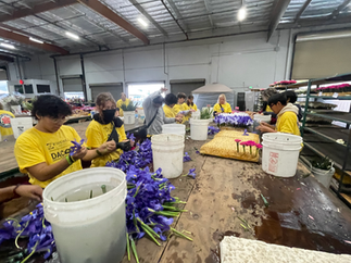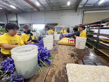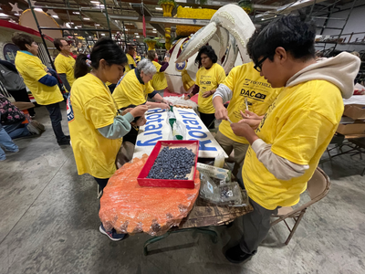 For six hours, our students cut and placed thousands of roses, mums, moss, and berries on the Rotary float. They finished the float so quickly that the team helped build the Trader Joe's and other floats with budding iris and placing them in vials to be used on other floats.